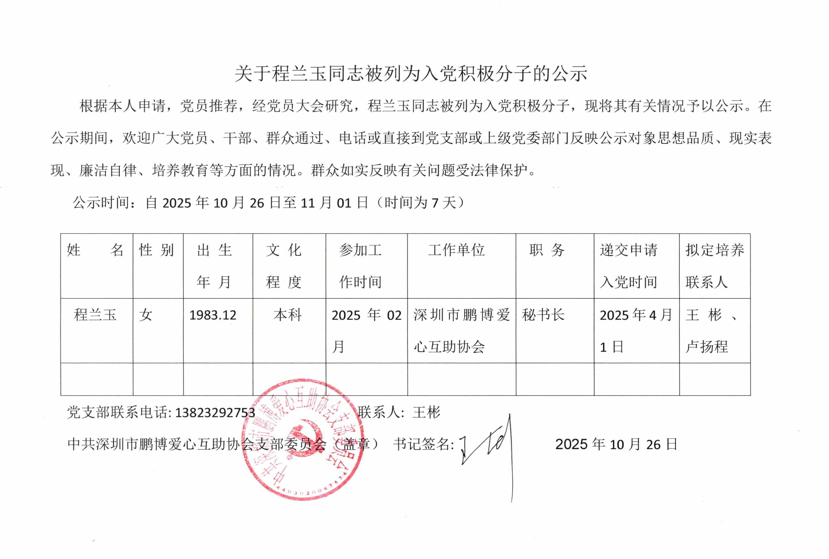根据本人申请,党员推荐,经党员大会研究,程兰玉同志被列为入党积极分子,现将其有关情况予以公示。在公示期间,欢迎广大党员、干部、群众通过、电话或直接到党支部或上级党委部门反映公示对象思想品质、现实表现、廉洁自律、培养教育等方面的情况。群众如实反映有关问题受法律保护。