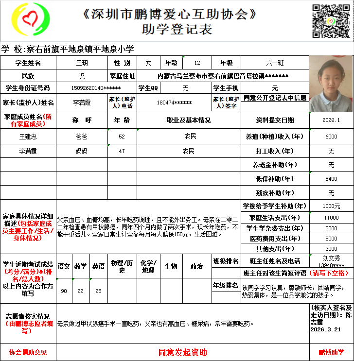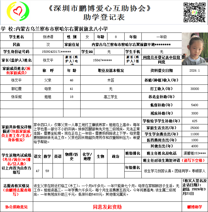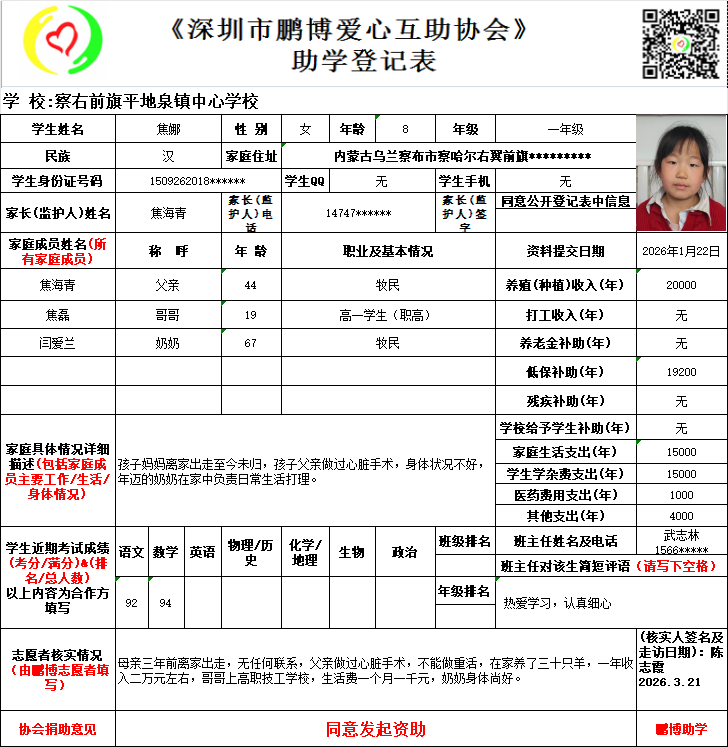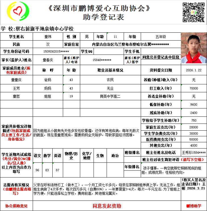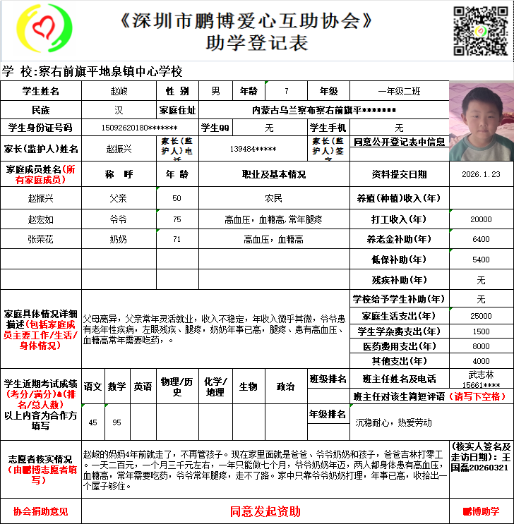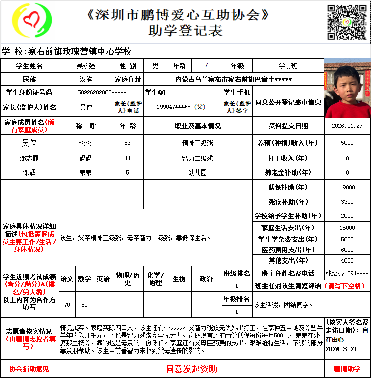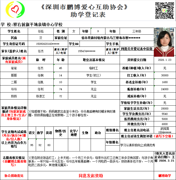 请将您选好的孩子登记表图片及您的姓名、QQ号码、微信号、电话号码及所在城市发给鹏博助学负责人(微信13823292753王先生)确认资助,并完成认捐程序。