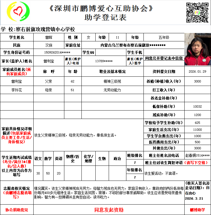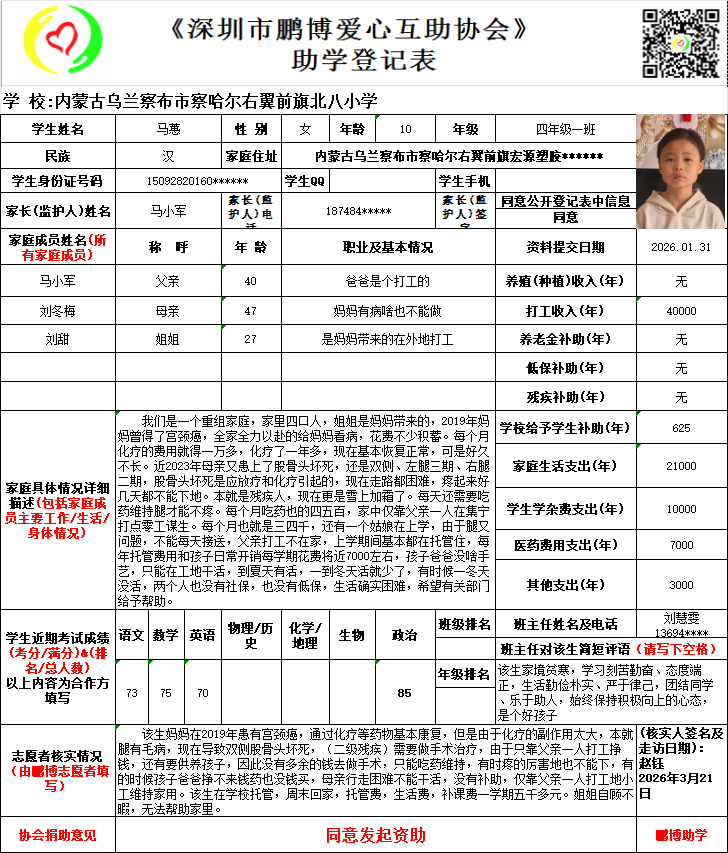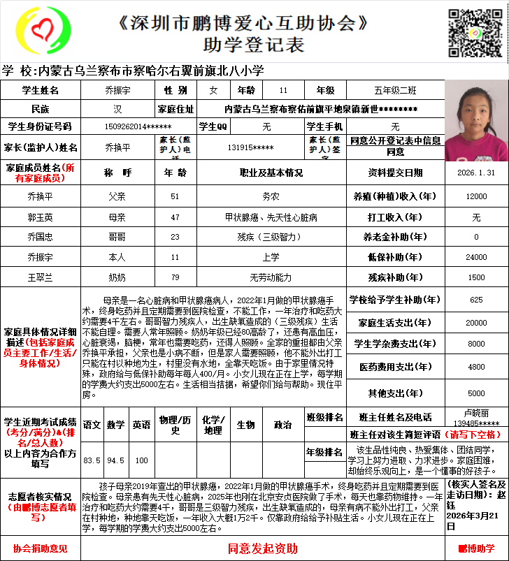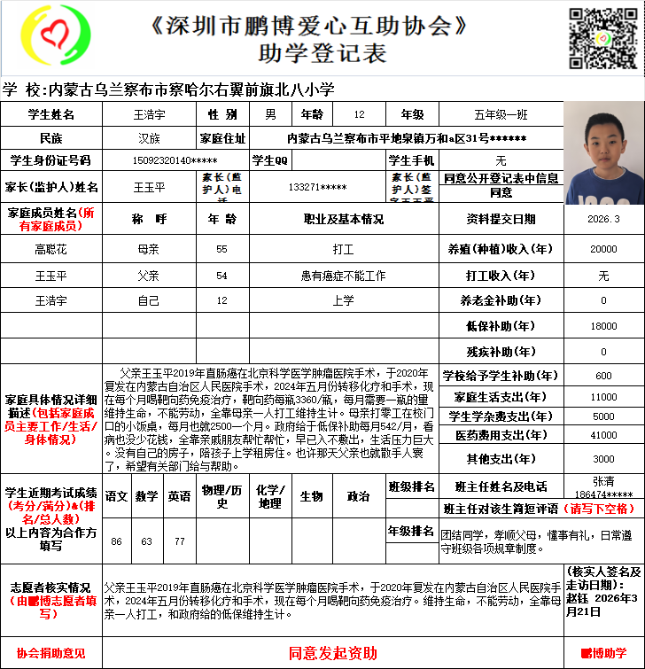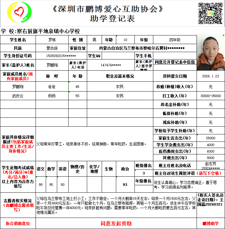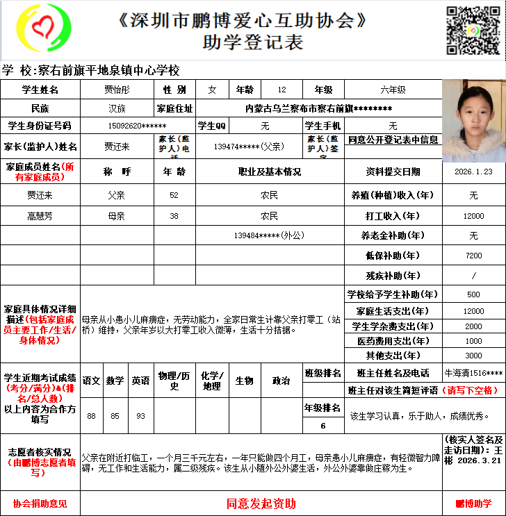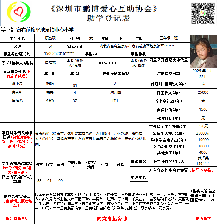请将您选好的孩子登记表图片及您的姓名、QQ号码、微信号、电话号码及所在城市发给鹏博助学负责人(微信13823292753王先生)确认资助,并完成认捐程序。