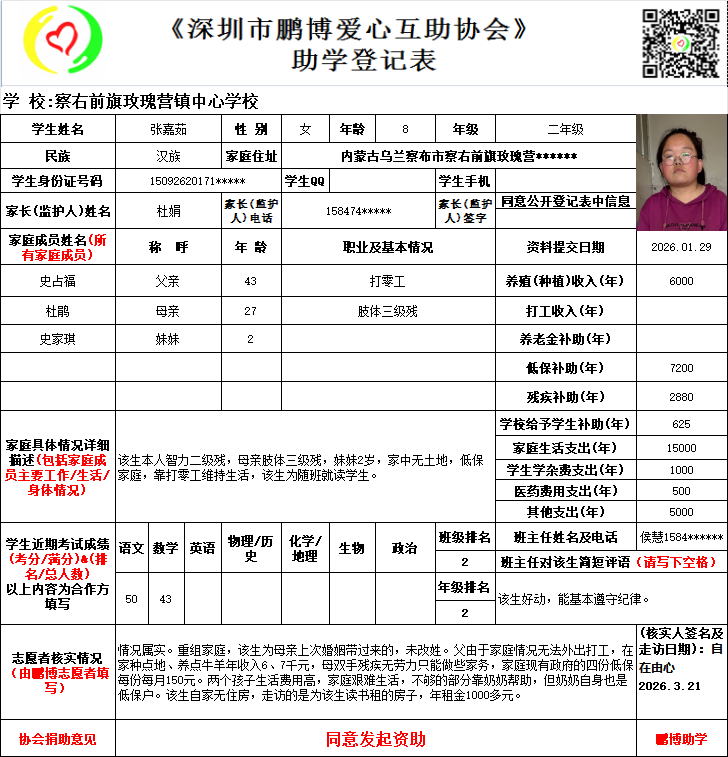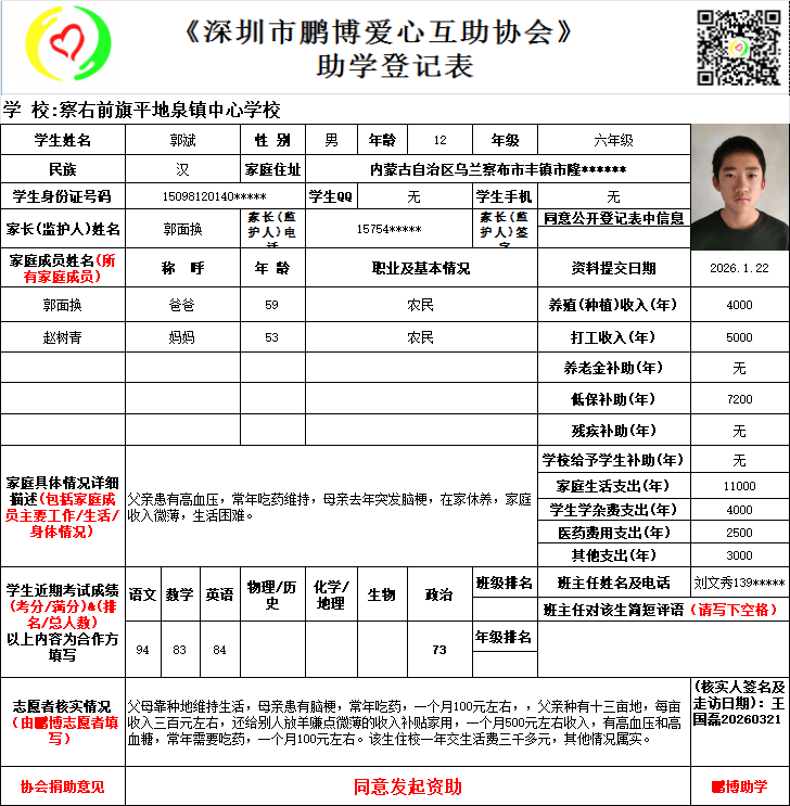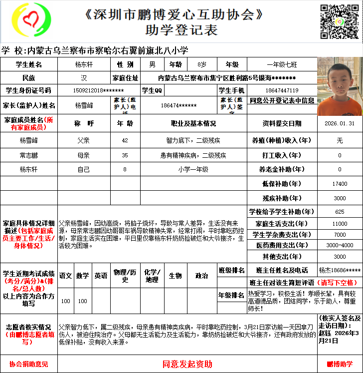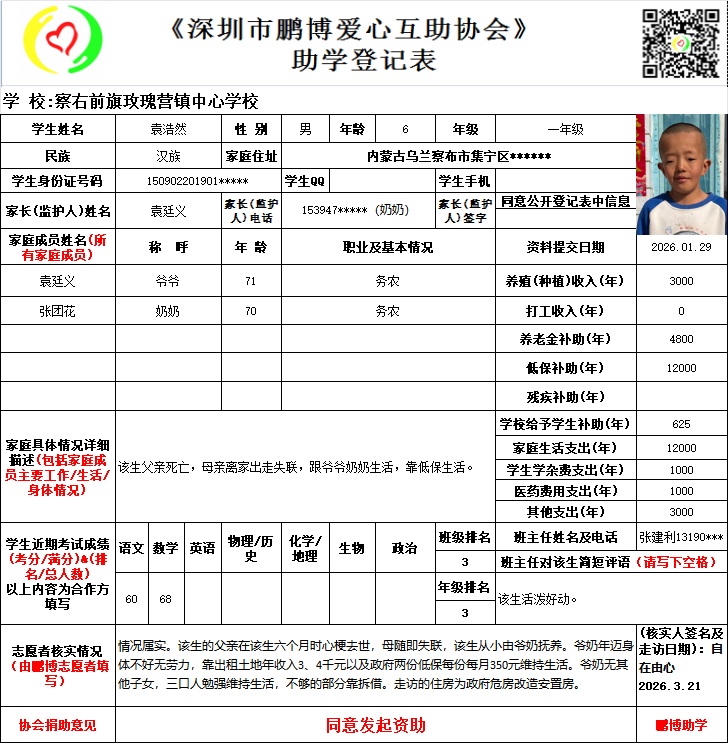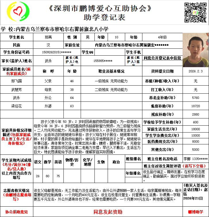 本次资助时间是从2026年9月开始计算,登记表上学生所读的年级在实际资助时会提升一级。