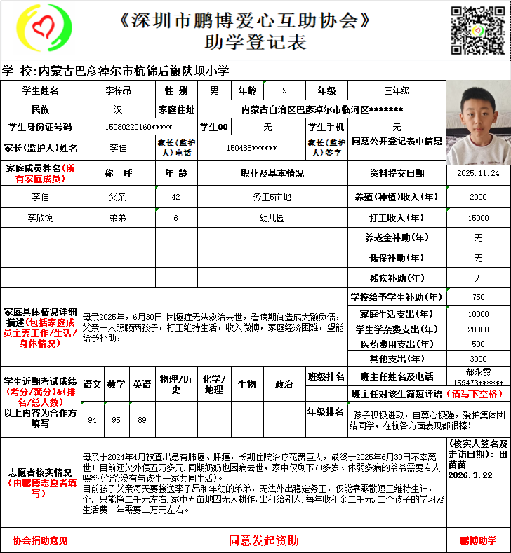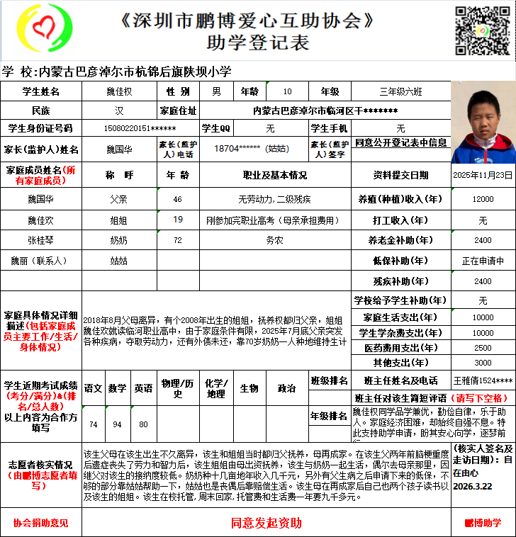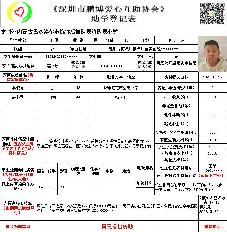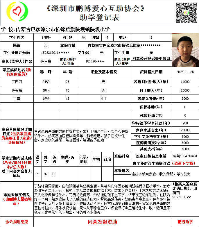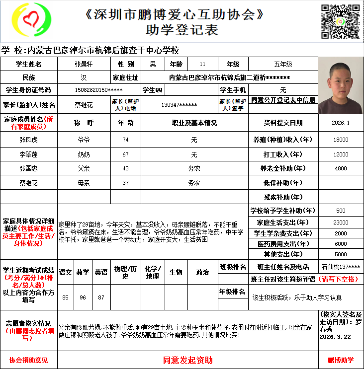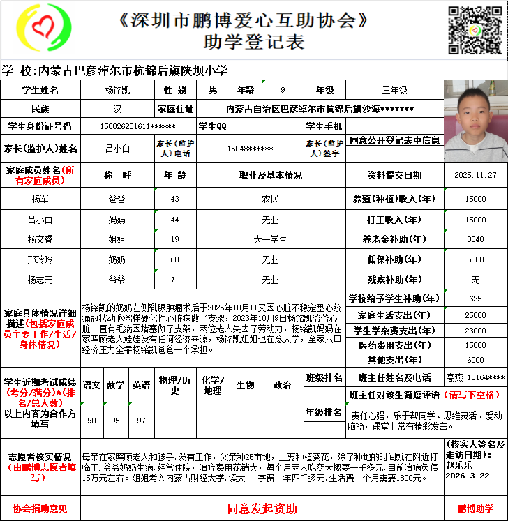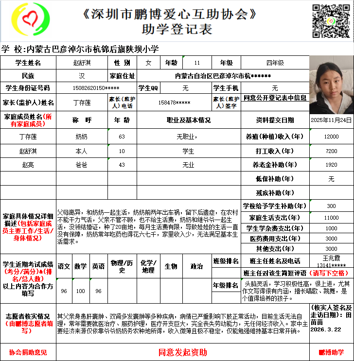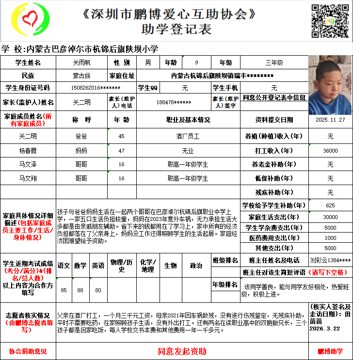 本次资助时间是从2026年9月开始计算,登记表上学生所读的年级在实际资助时会提升一级。