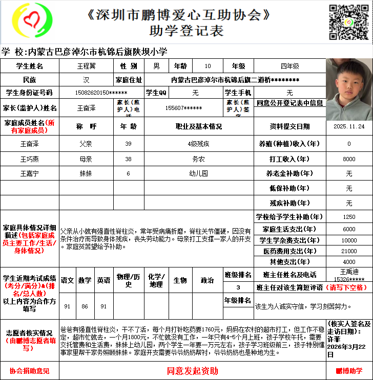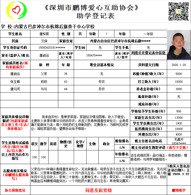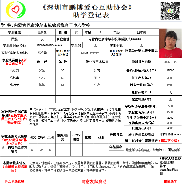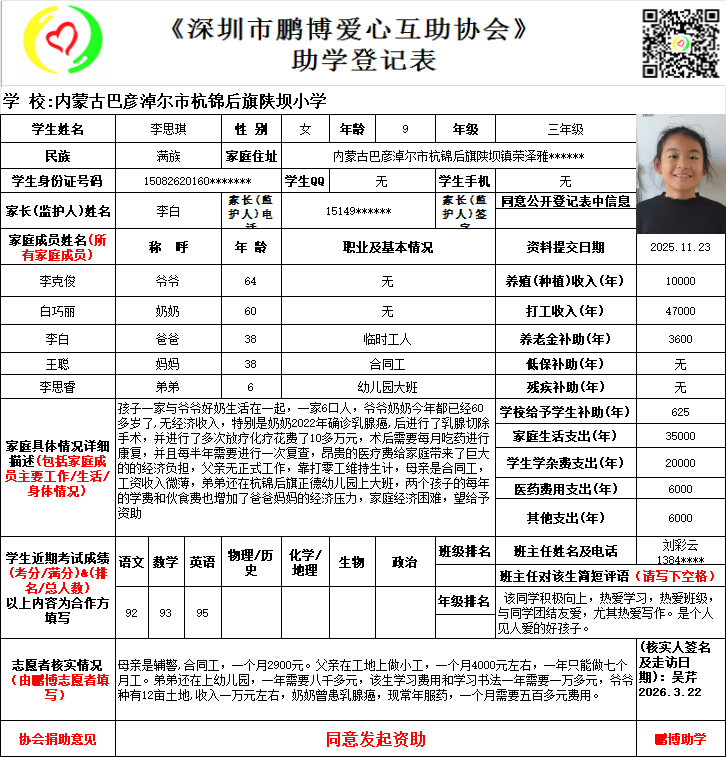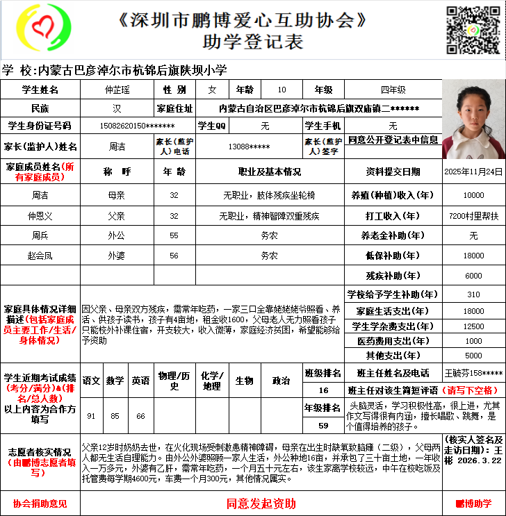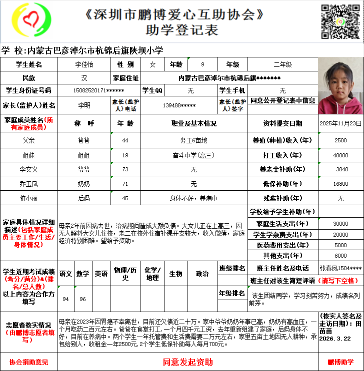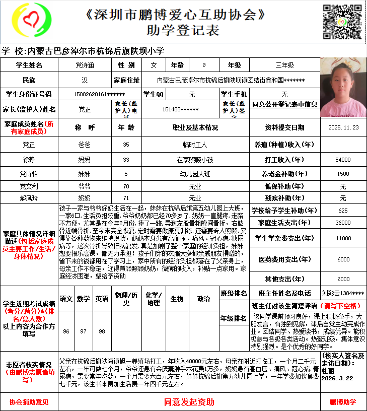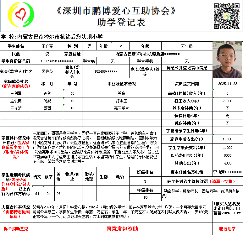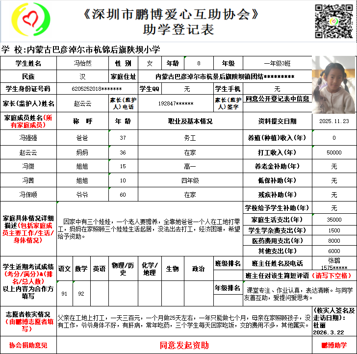 请将您选好的孩子登记表图片及您的姓名、QQ号码、微信号、电话号码及所在城市发给鹏博助学负责人(微信13823292753王先生)确认资助,并完成认捐程序。