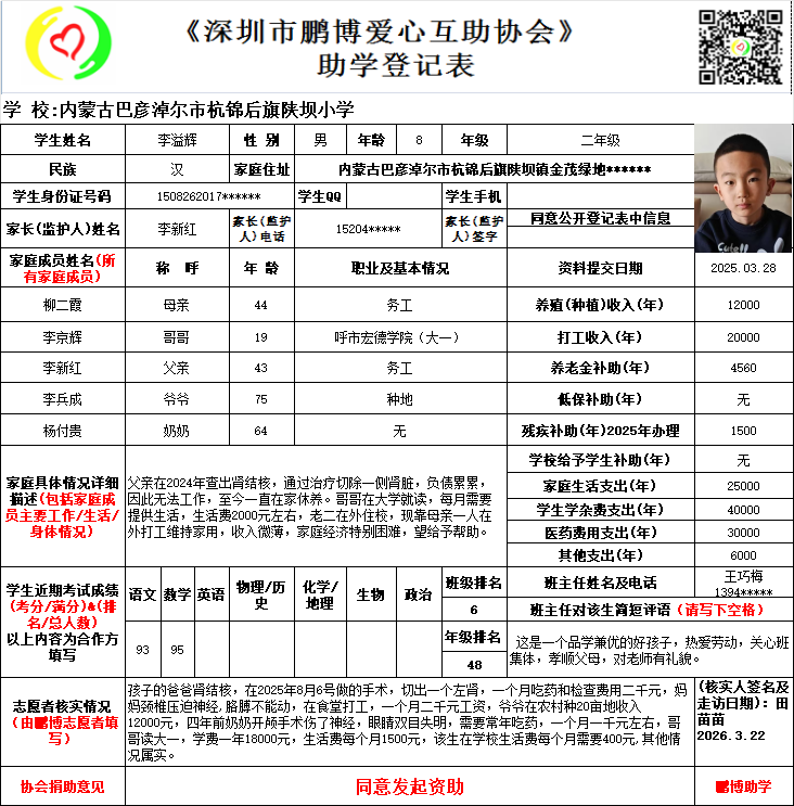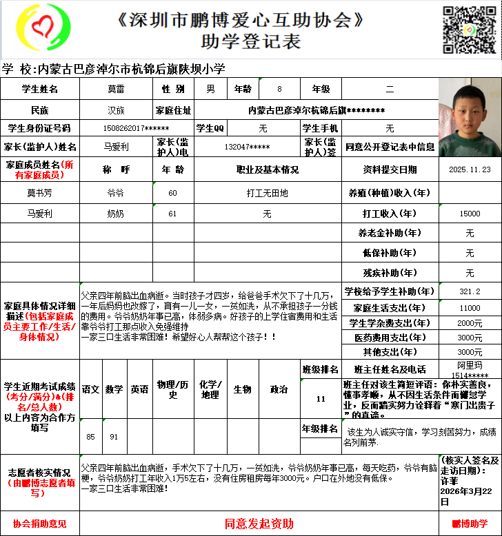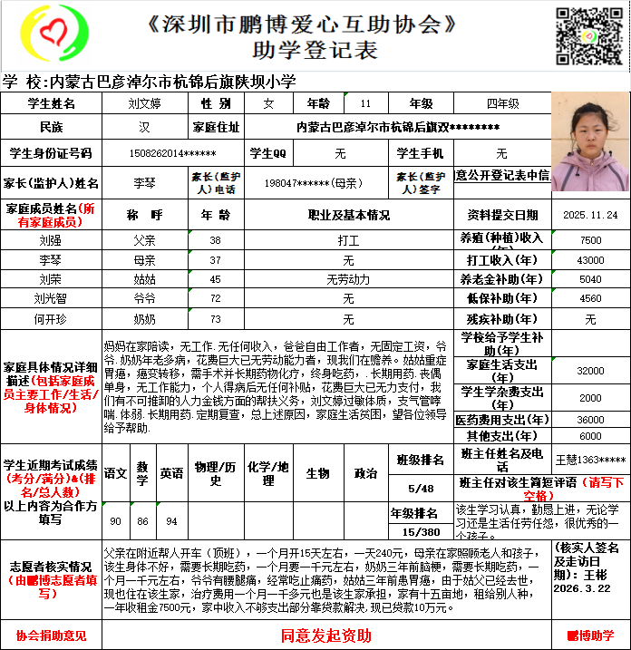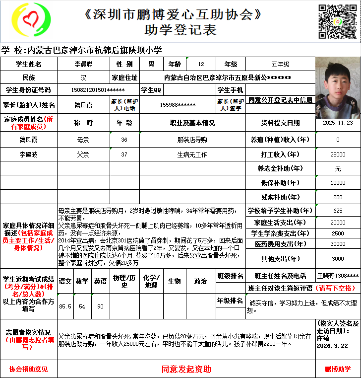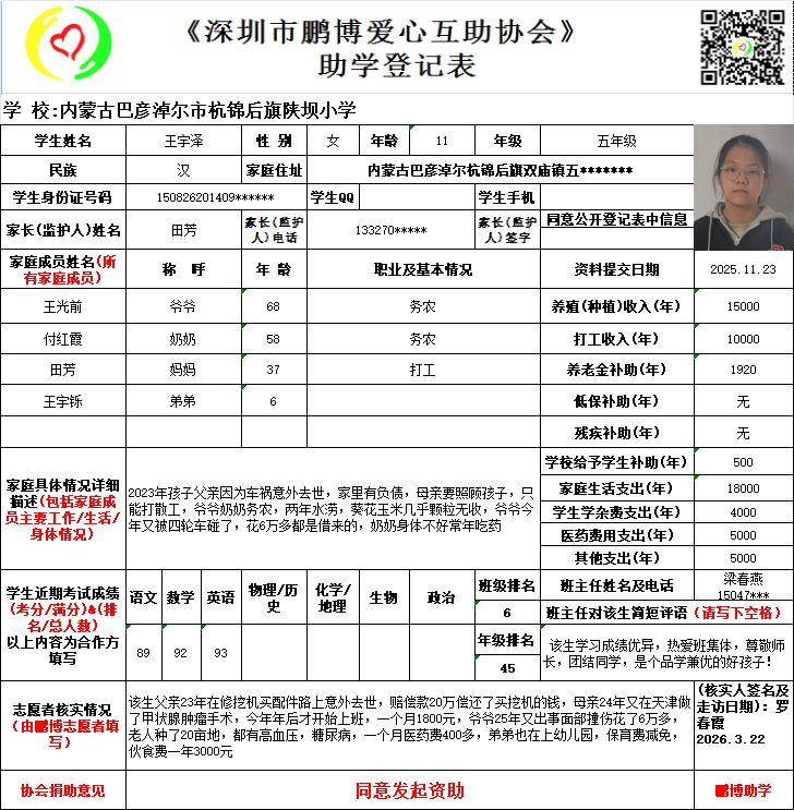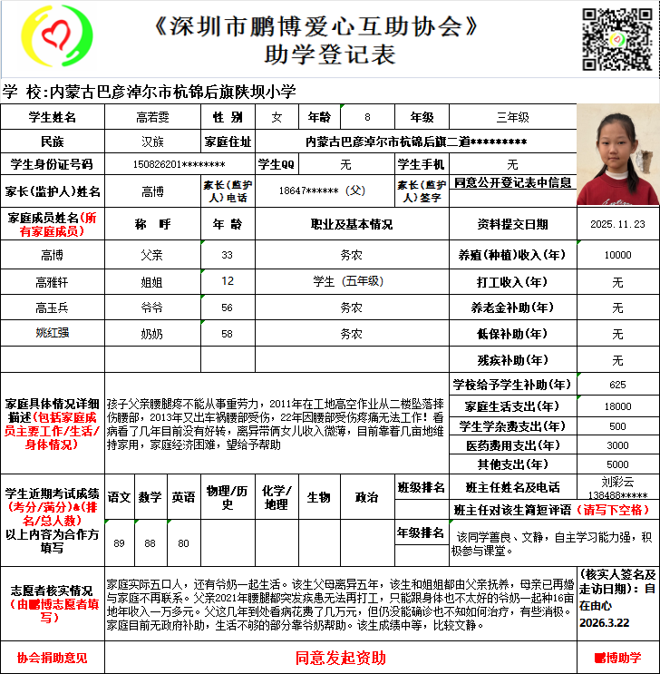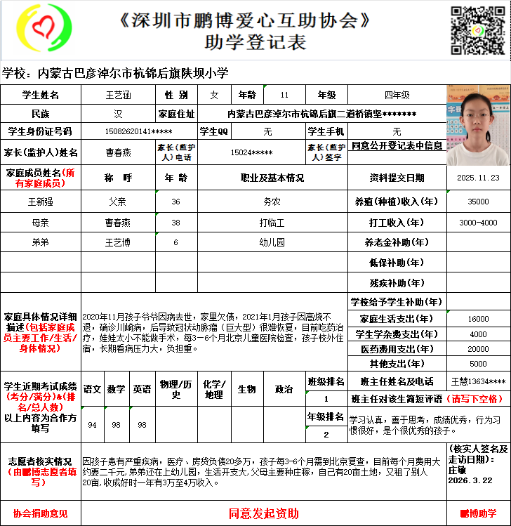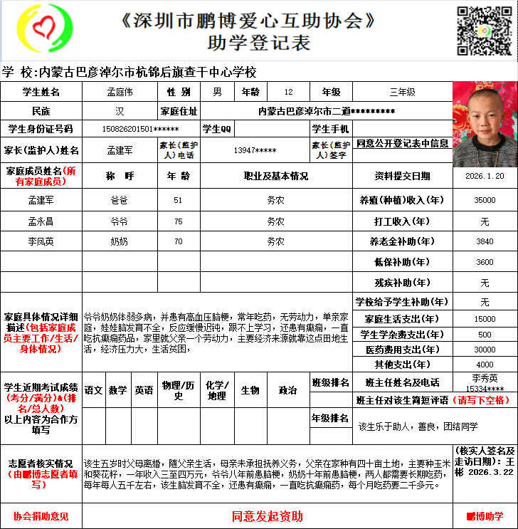 请将您选好的孩子登记表图片及您的姓名、QQ号码、微信号、电话号码及所在城市发给鹏博助学负责人(微信13823292753王先生)确认资助,并完成认捐程序。
