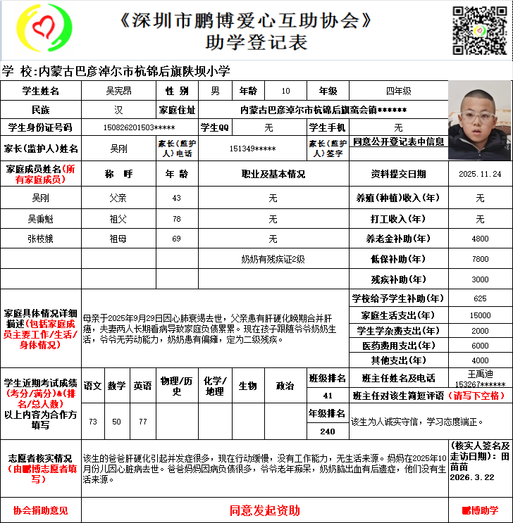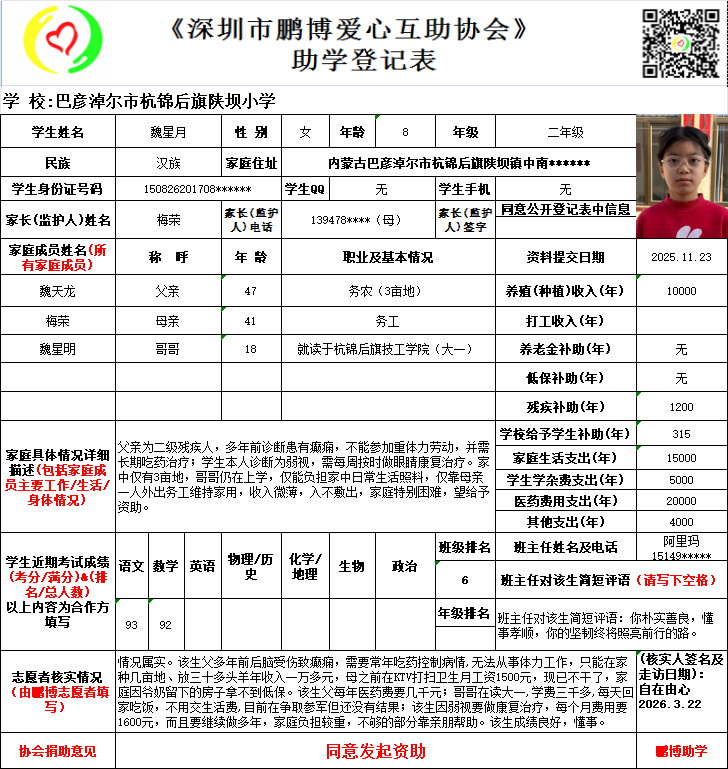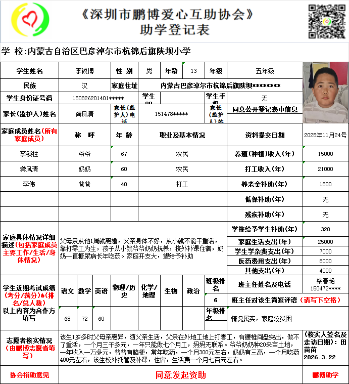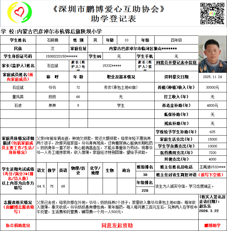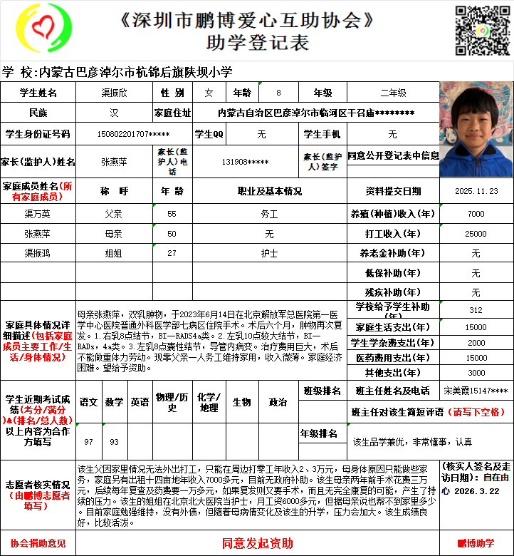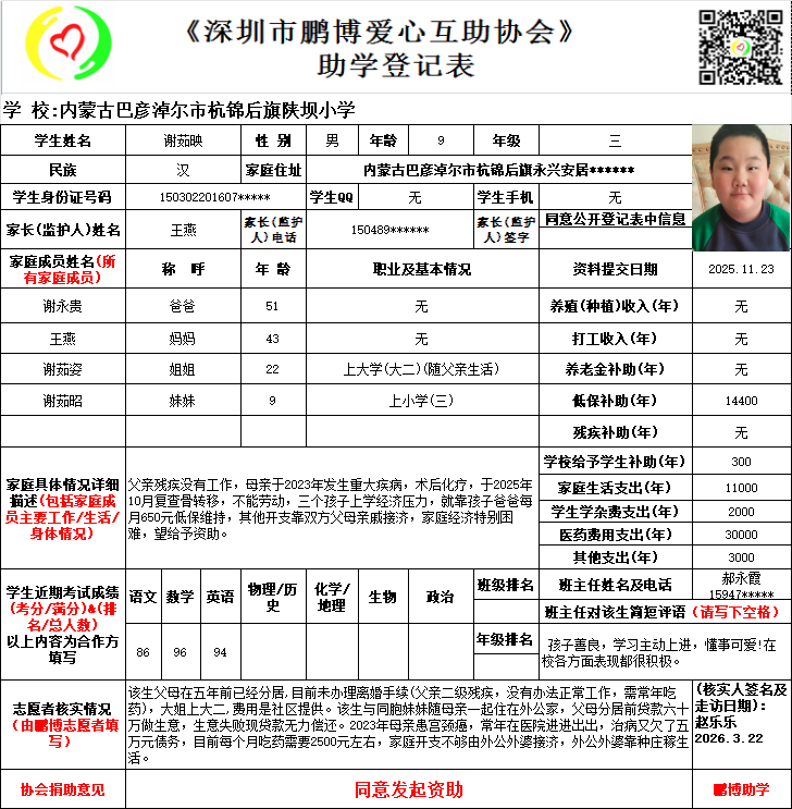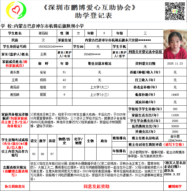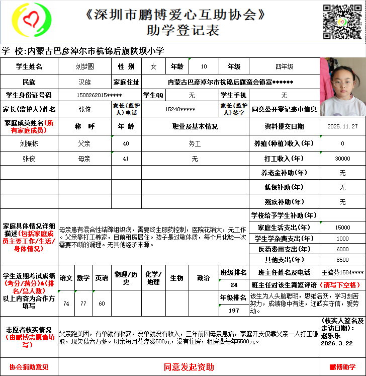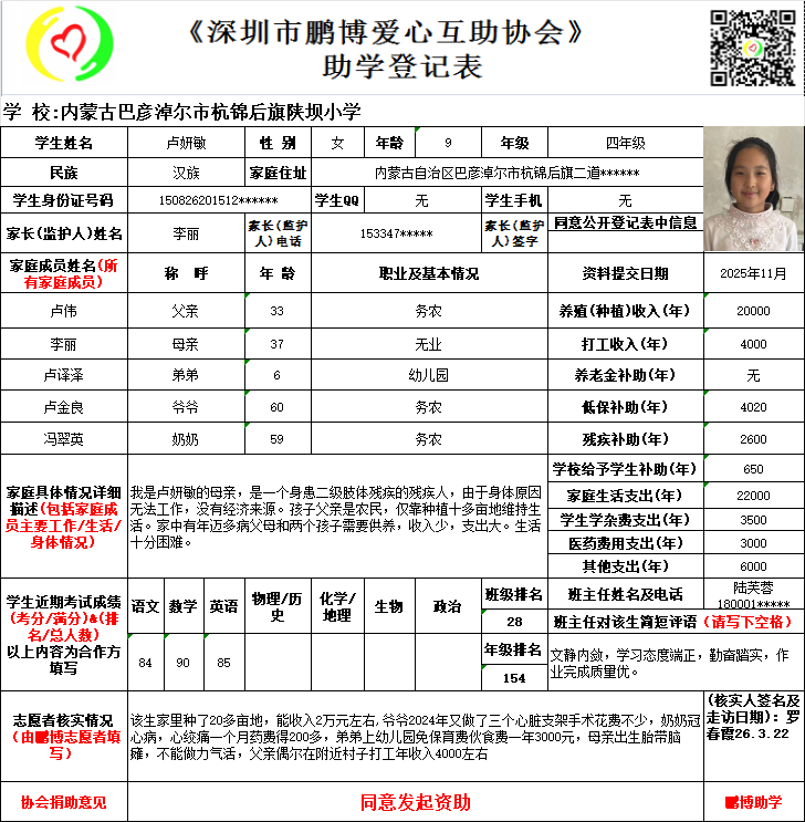 请将您选好的孩子登记表图片及您的姓名、QQ号码、微信号、电话号码及所在城市发给鹏博助学负责人(微信13823292753王先生)确认资助,并完成认捐程序。