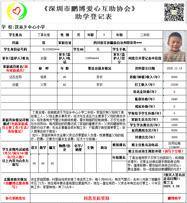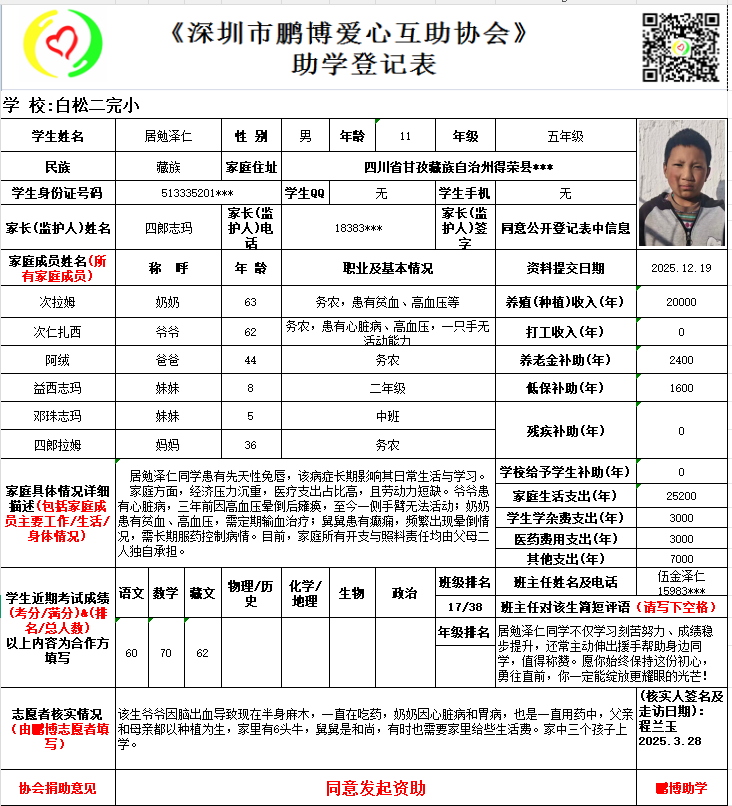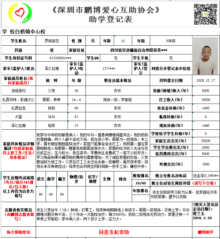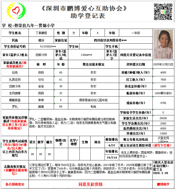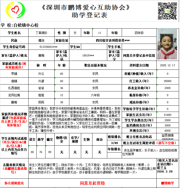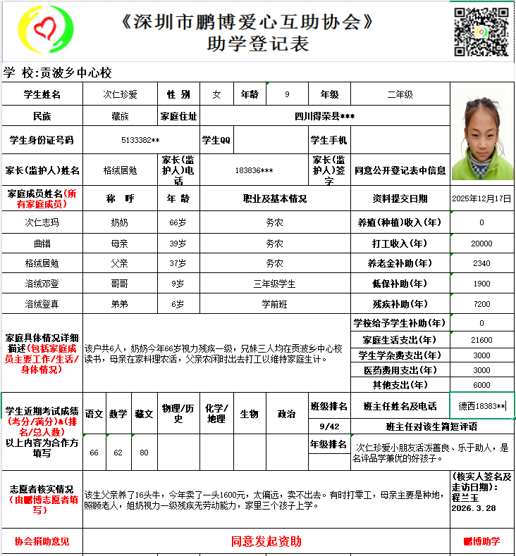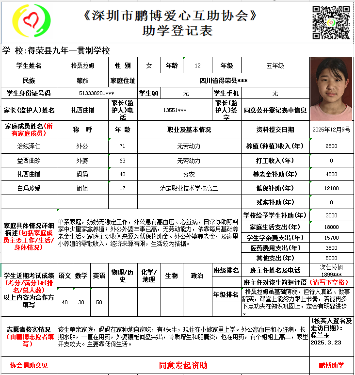 请将您选好的孩子登记表图片及您的姓名、QQ号码、微信号、电话号码及所在城市发给鹏博助学负责人(微信13823292753王先生)确认资助,并完成认捐程序。