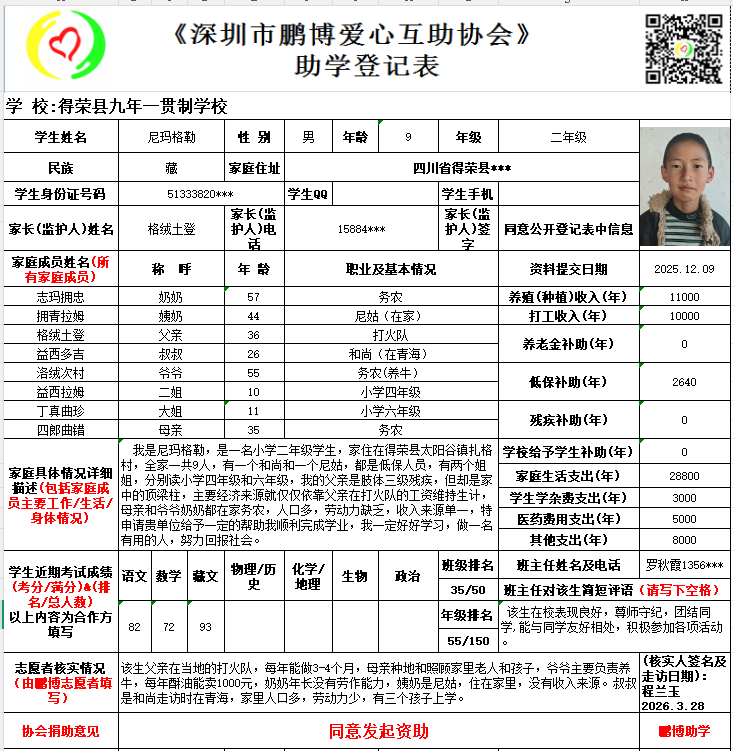 本次资助时间是从2026年9月开始计算,登记表上学生所读的年级在实际资助时会提升一级。