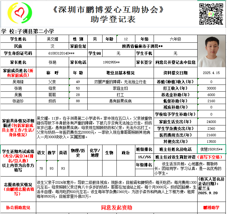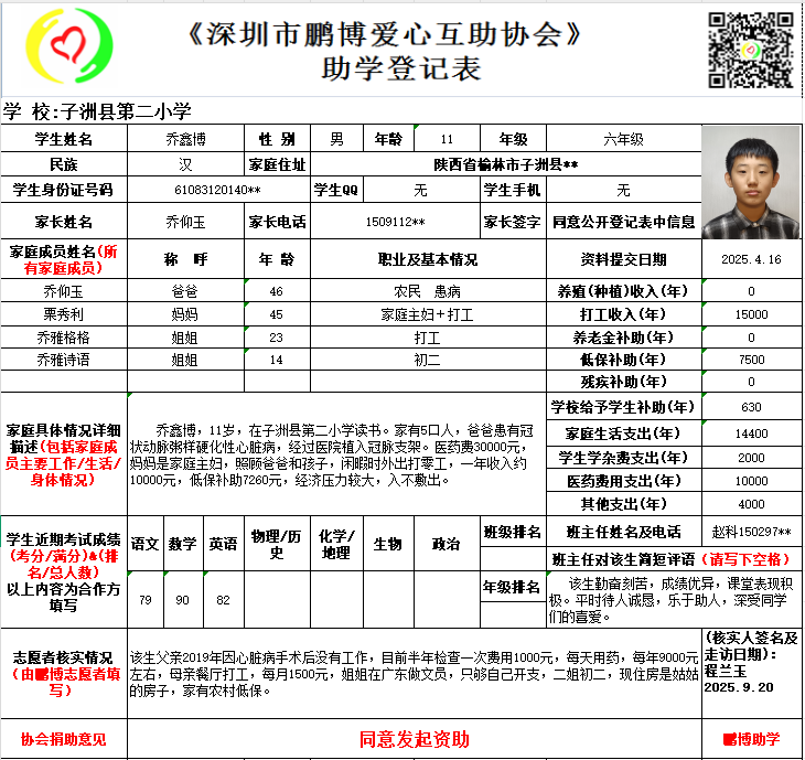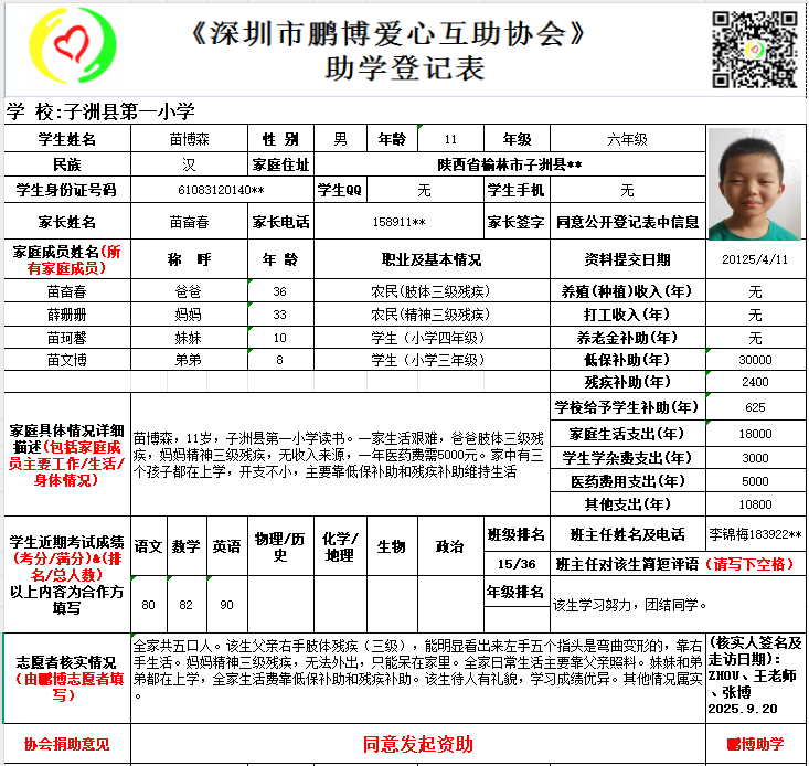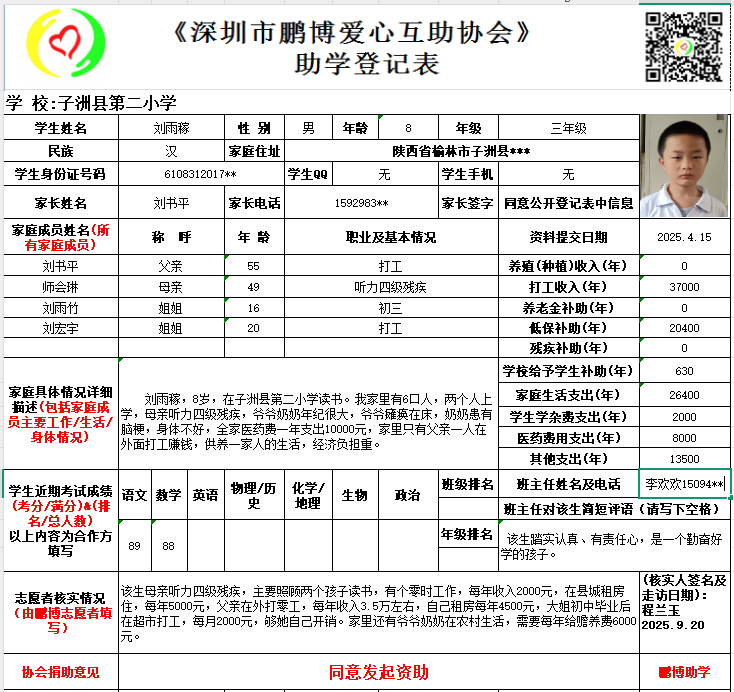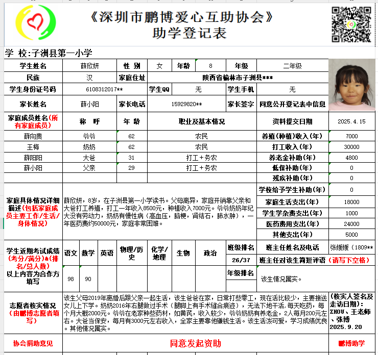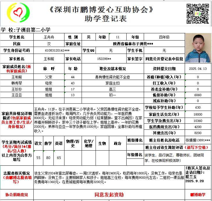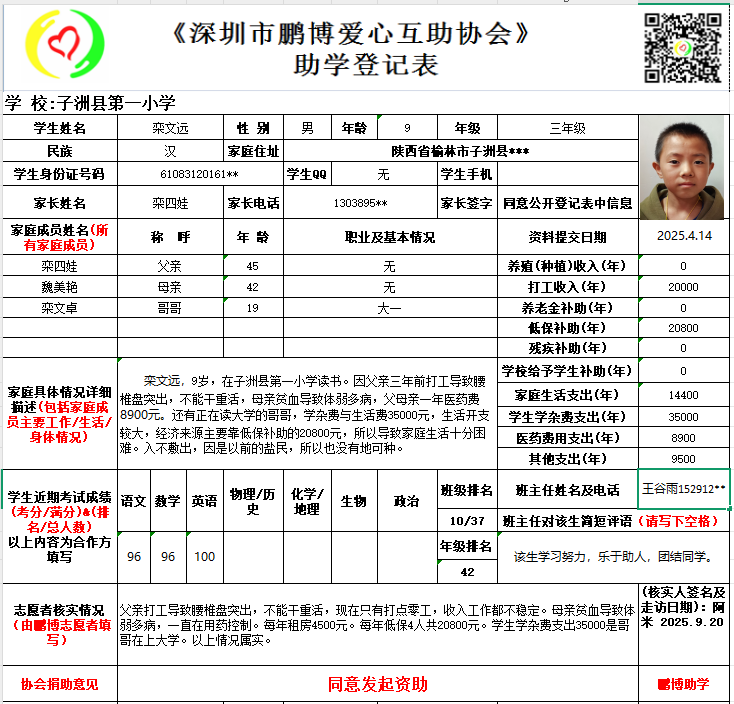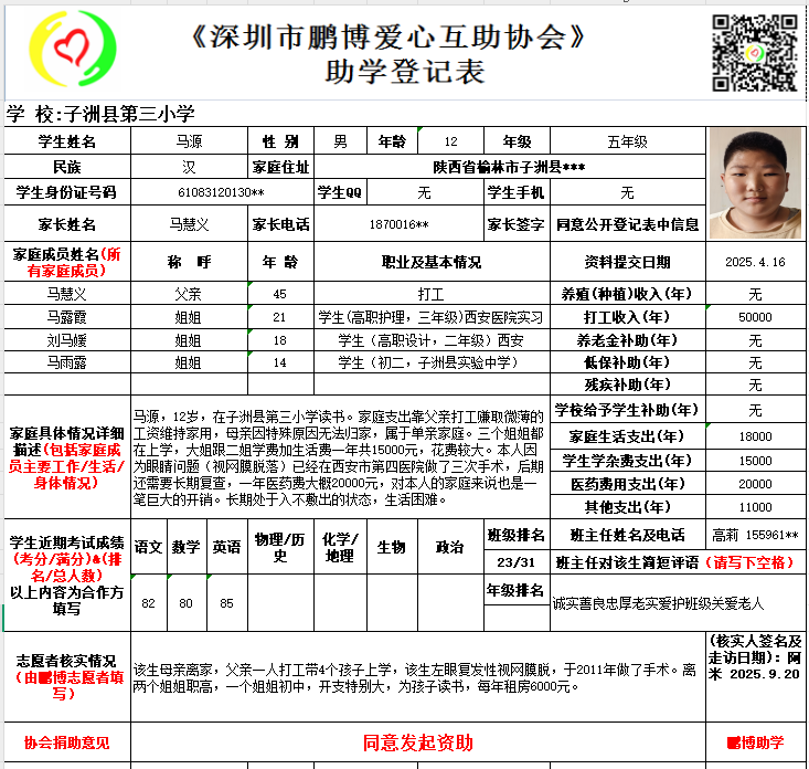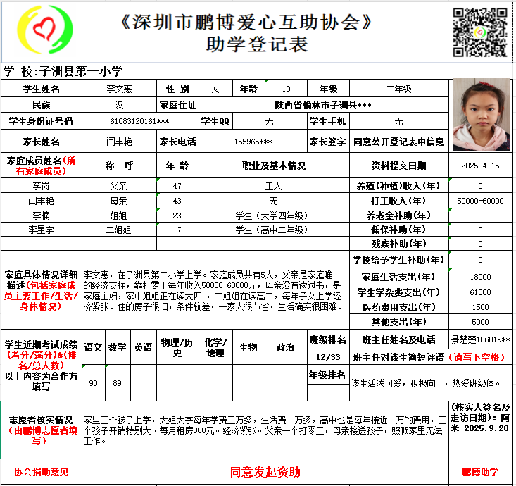 请将您选好的孩子登记表图片及您的姓名、QQ号码、微信号、电话号码及所在城市发给鹏博助学负责人(微信13823292753王先生)确认资助,并完成认捐程序。