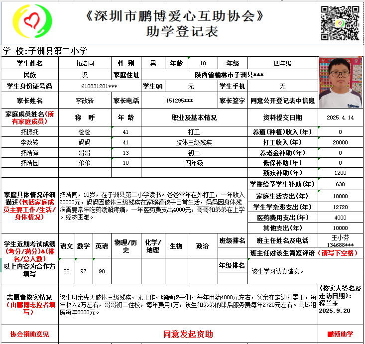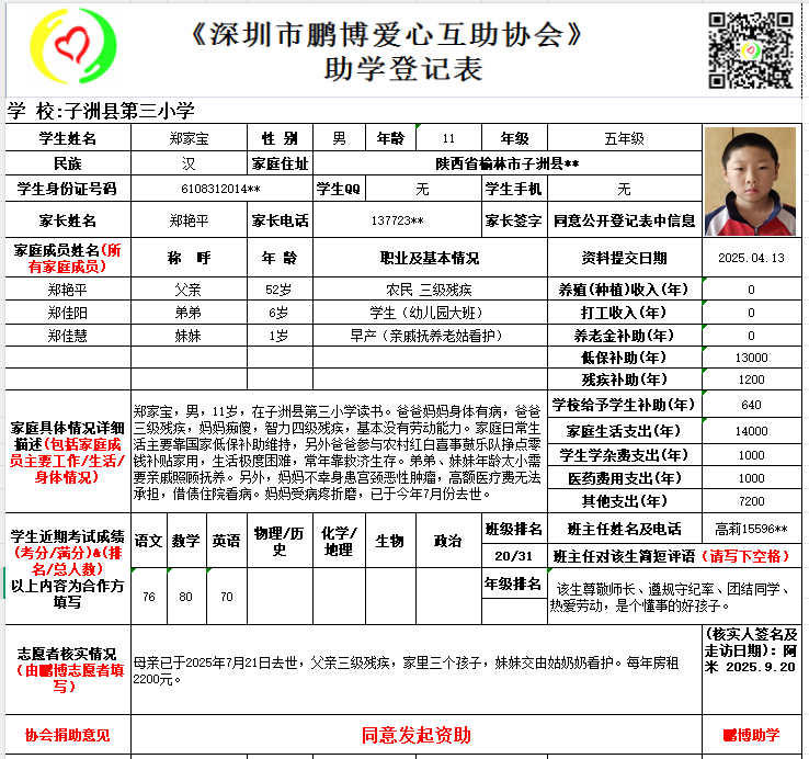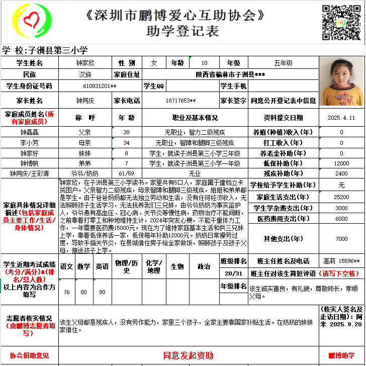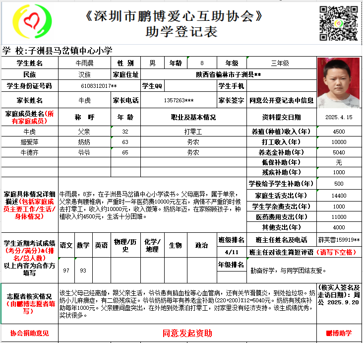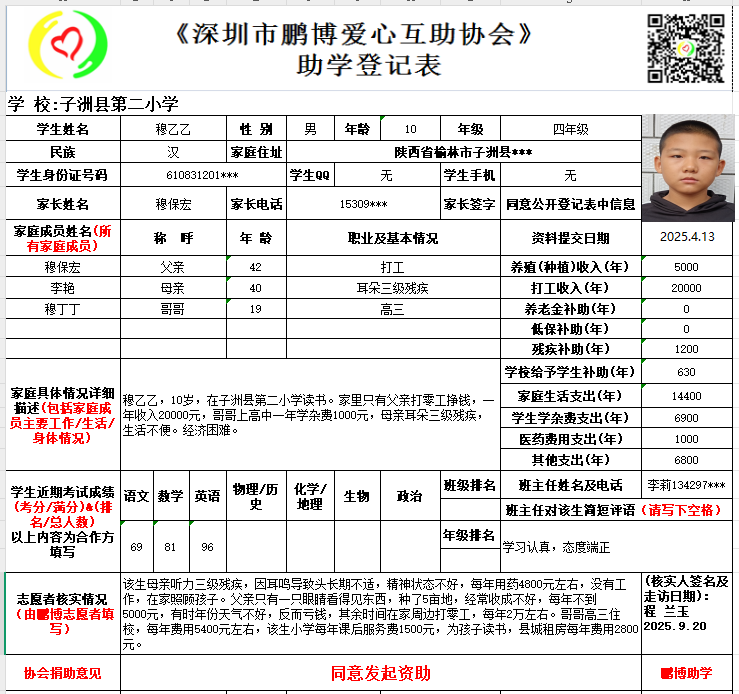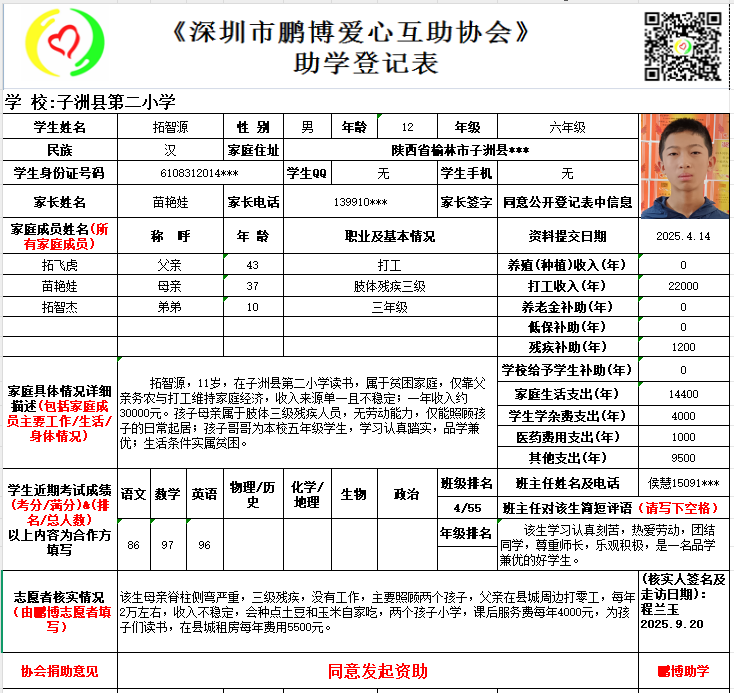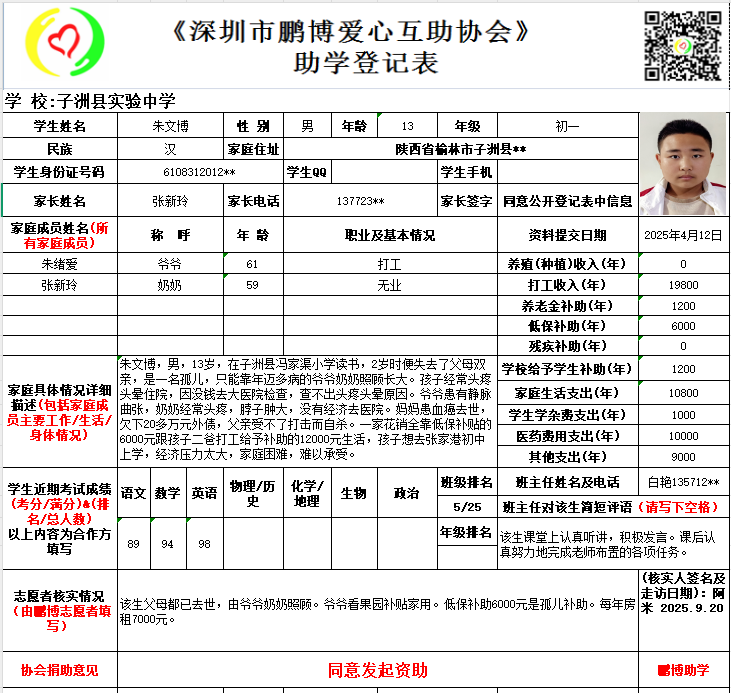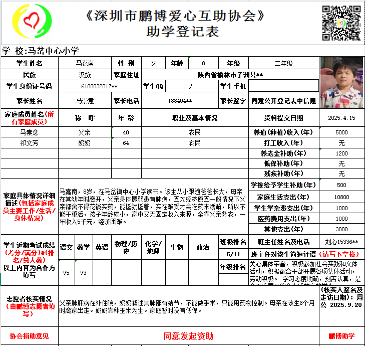 请将您选好的孩子登记表图片及您的姓名、QQ号码、微信号、电话号码及所在城市发给鹏博助学负责人(微信13823292753王先生)确认资助,并完成认捐程序。