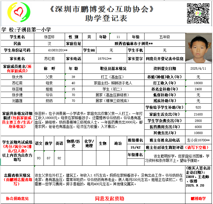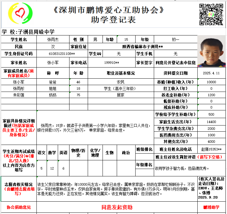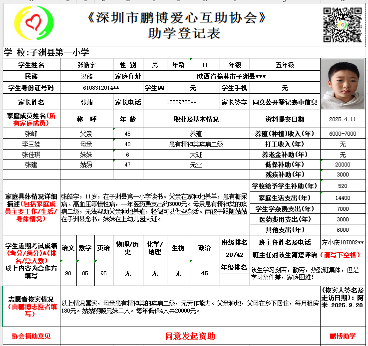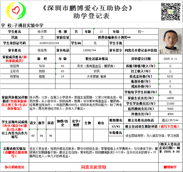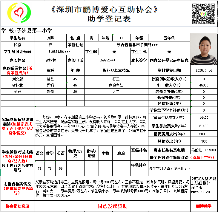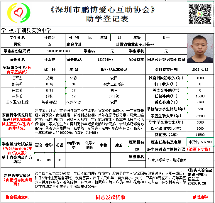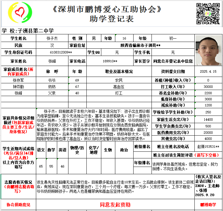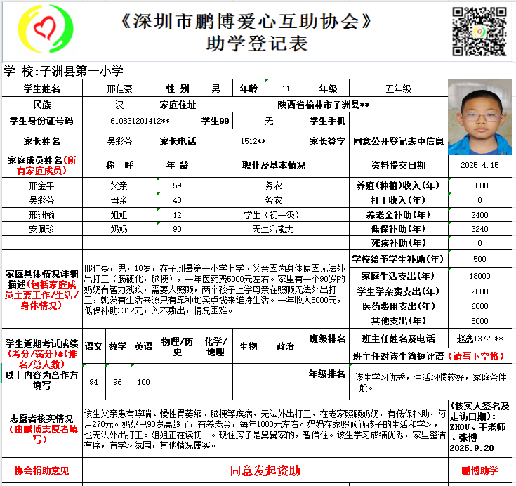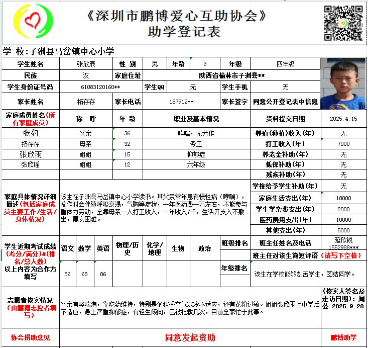 请将您选好的孩子登记表图片及您的姓名、QQ号码、微信号、电话号码及所在城市发给鹏博助学负责人(微信13823292753王先生)确认资助,并完成认捐程序。