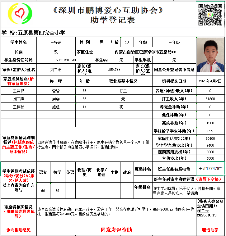 请将您选好的孩子登记表图片及您的姓名、QQ号码、微信号、电话号码及所在城市发给鹏博助学负责人(微信13823292753王先生)确认资助,并完成认捐程序。